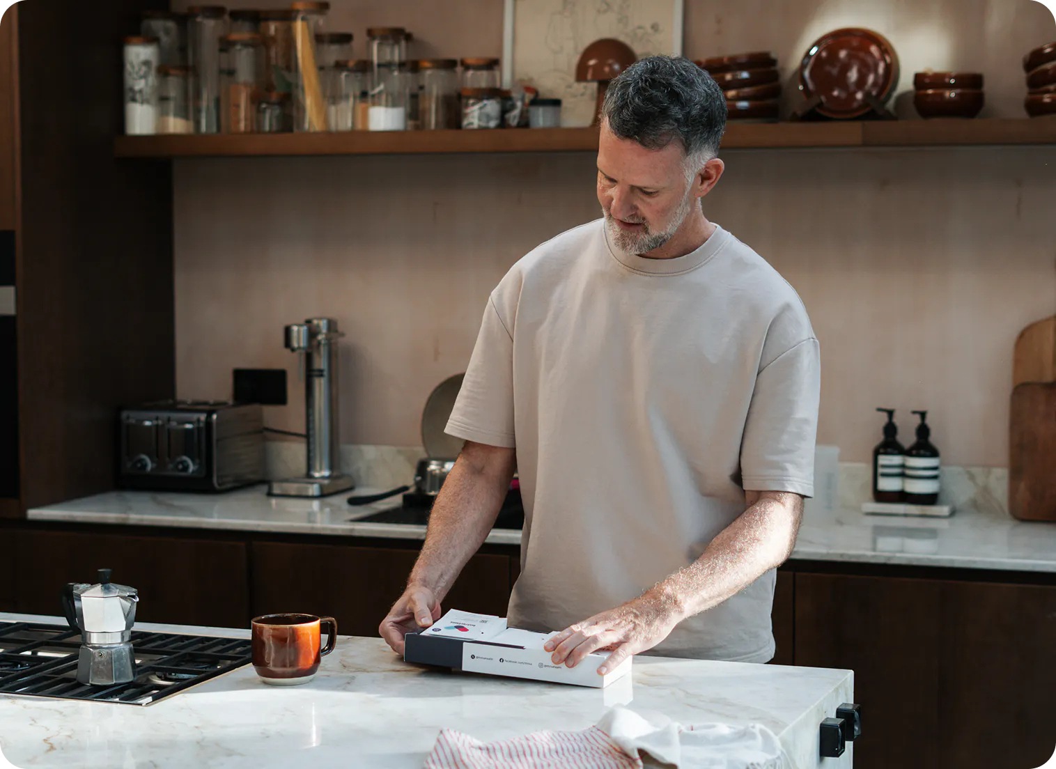 You test at home in around ten minutes. Our Autodraw device collects a blood sample from your arm — no needles, no clinics. Accuracy is validated against venous blood draws, and samples are processed by UKAS-accredited laboratories. If a sample doesn't produce results, we send a replacement at no extra cost.