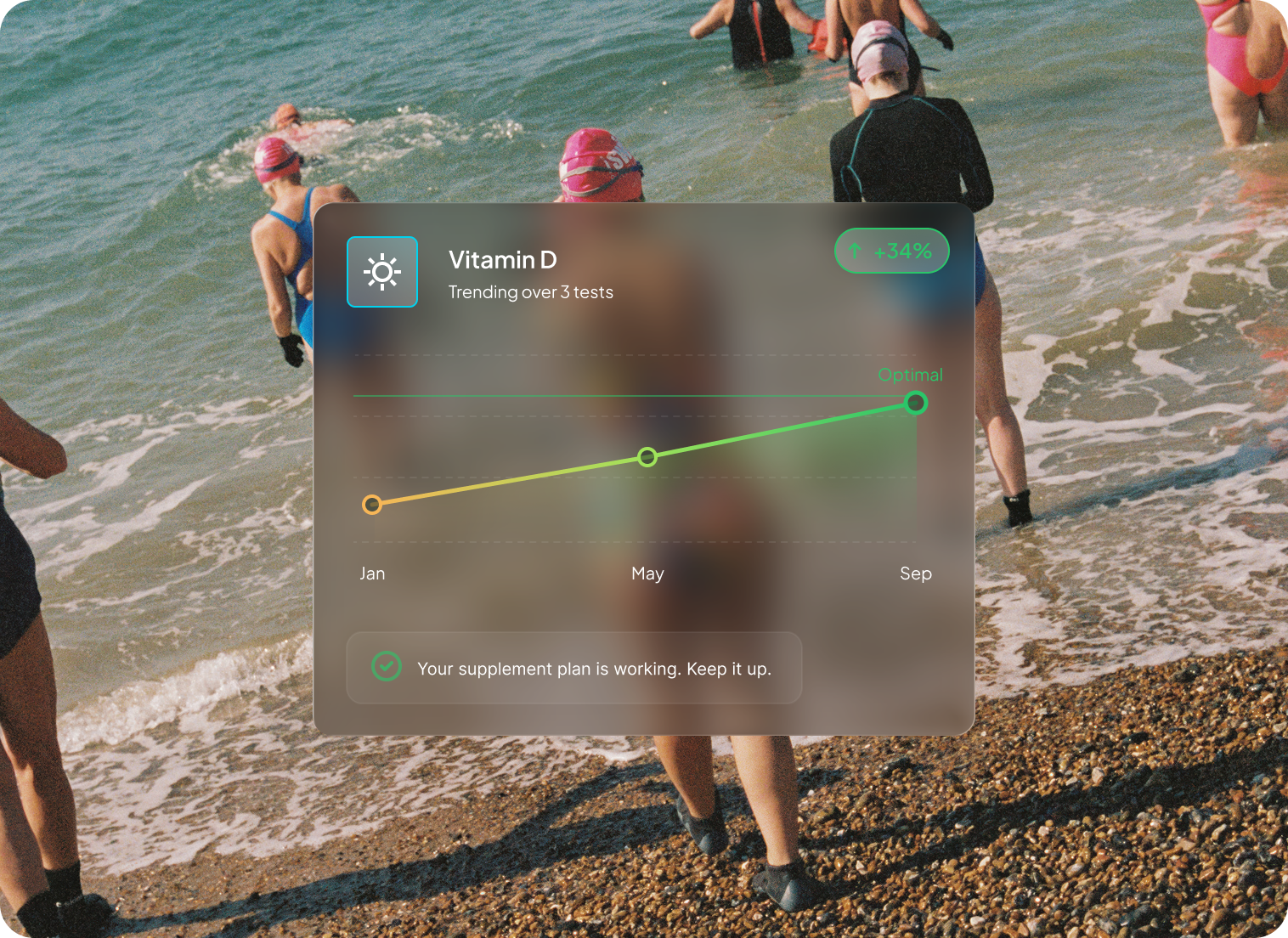 Proactive insights based on your blood results, wearable data, and goals — plus a 24/7 Health Assistant for when questions come up. Guidance that's grounded in your data, not generic advice.