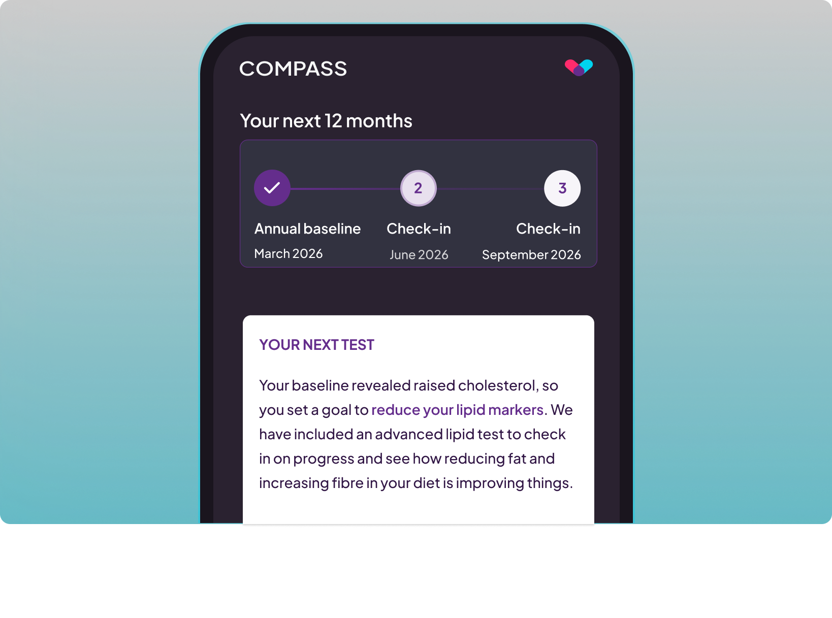 Most health programmes give everyone the same tests. Compass is different. It starts with a broad baseline to understand where your health stands today. Each follow-up focuses on what your results actually showed, and your health goals.